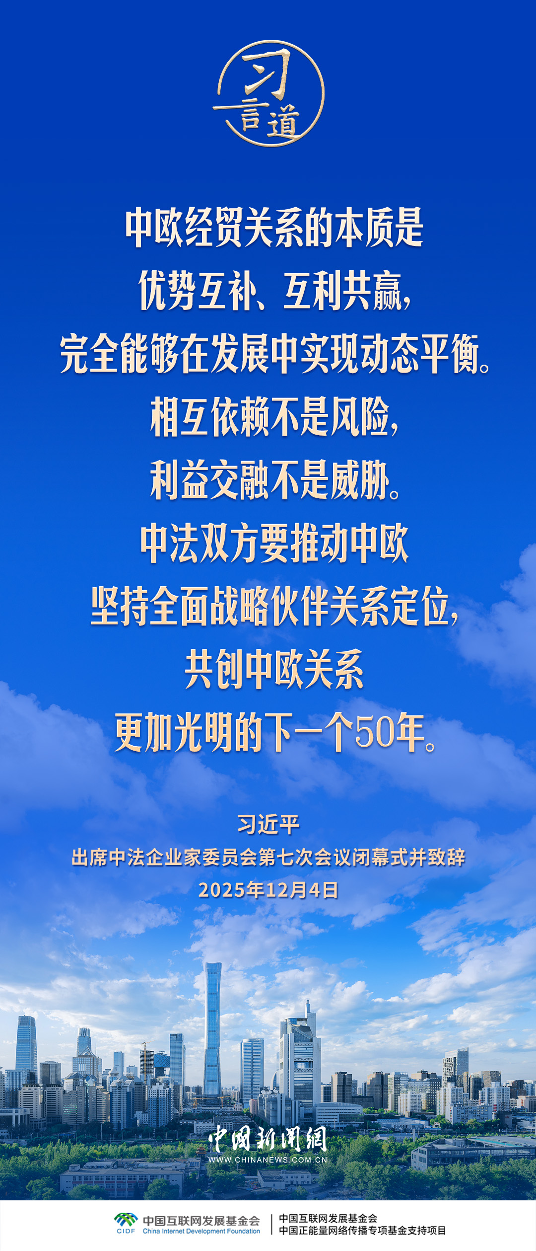 12月4日,国家主席习近平在北京同法国总统马克龙共同出席中法企业家委员会第七次会议闭幕式并致辞。习近平指出——